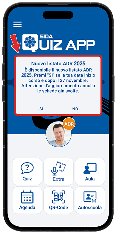 Un messaggio nell'applicazione avvisa dell'entrata in vigore del nuovo listato ADR. I candidati che hanno una data di inizio corso che parte dal 27 novembre dovranno rispondere SI; gli altri (per continuare ad esercitarsi con il listato 2023) dovranno rispondere NO.